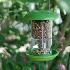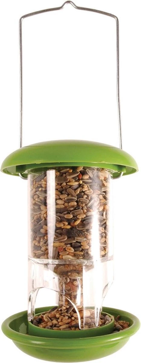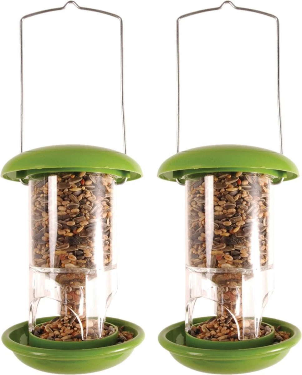 2x mangeoires pour oiseaux silo plastique vert 17 cm. Ce silo d’alimentation a trois trous pour que les oiseaux puissent manger. De plus, le silo contient un bac de récupération avec des trous de drainage afin que les aliments ne puissent pas rester dans l’eau de pluie. Le silo mangeoire à oiseaux est facile à accrocher à une branche ou à un crochet. Dimensions : environ 12 x 12 x 17 cm. Matière : plastique.