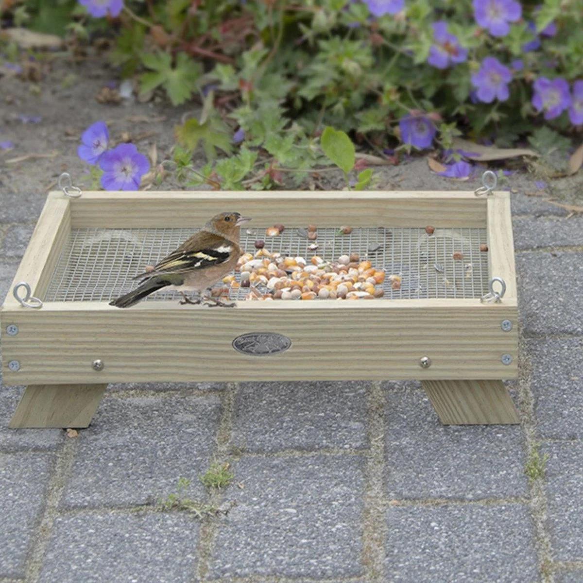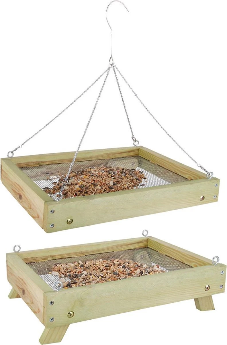 2x morceaux de mangeoire à oiseaux en bois de table debout et suspendus 35 cm. Cette mangeoire à oiseaux est équipée de pieds pour que vous puissiez la poser au sol.De plus, vous pouvez également accrocher la mangeoire à oiseaux dans l’arbre ou sur un balcon en utilisant les crochets fournis. La maille au milieu assure un drainage optimal de l’eau. Convient pour la nourriture grossière pour oiseaux, par exemple les noix. Dimensions : environ 28 x 35 x 11 cm. Matériel: bois, maille.