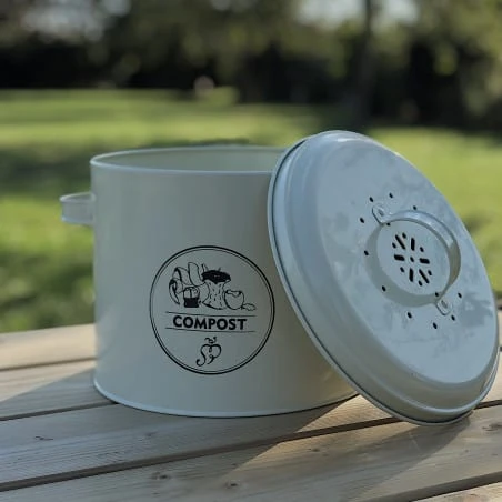 Cette boîte authentique permet de collecter les épluchures de pomme de terre, le marre de café et tout autre déchet réutilisable afin de les déposer plus tard dans le tas de compost.
