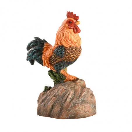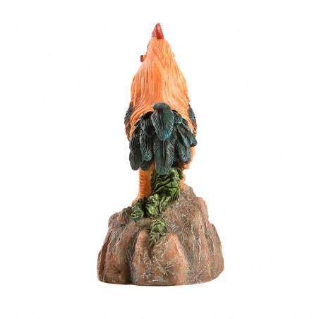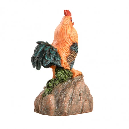 Magnifique coq sur son socle. Fabriqué en poly-résine, il résistera aux intempéries et au rayons du soleil. Dans sa position imposante ce coq chante dès qu’il aperçoit un mouvement.