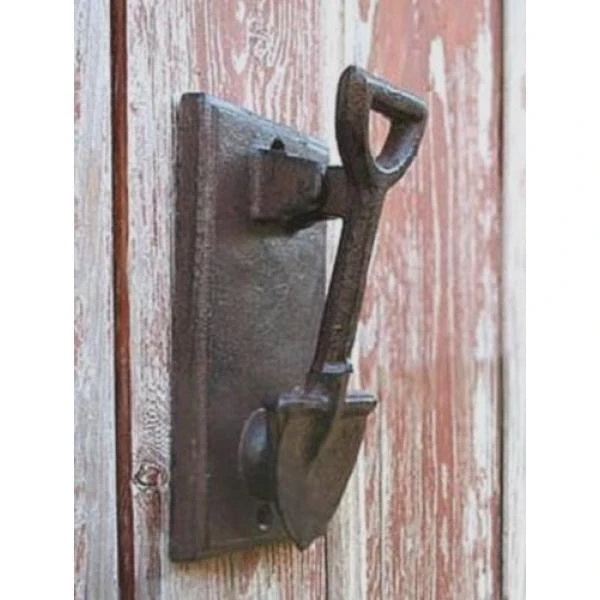 Un heurtoir original en fonte avec une pelle dĂ©corative. Un Ă©lĂ©ment aussi bien dĂ©coratif que fonctionnel sur la porte de la maison, de l’abri de jardin… Il fait en sorte d’entendre clairement quand vos invitĂ©s sont Ă la porte.