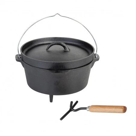 La fonte garantit une répartition de la chaleur uniforme à travers le four hollandais. Du charbon ou des briquettes peuvent être placés sur le dessus du couvercle pour créer une chaleur supplémentaire. Les trois pieds permettent au faitout d’être stable et il peut être suspendu au-dessus du feu grâce à l’encoche du crochet de suspension de la poignée.