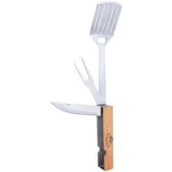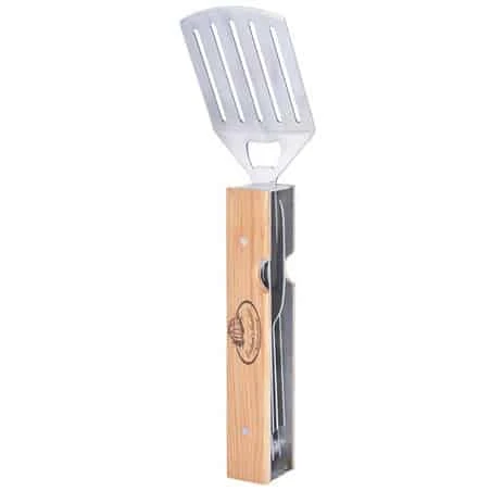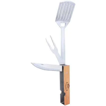 Accessoires pour barbecue ingénieux qui regroupe 4 accessoires en 1 seul : la spatule permettant de disposer les aliments sur le barbecue, le couteau cranté pour découper vos morceaux de viande et la fourchette à 2 dents pour attraper vos aliments. Sans oublier le décapsuleur qui peut toujours être utile lors de dîner ou déjeuner autour du barbecue.