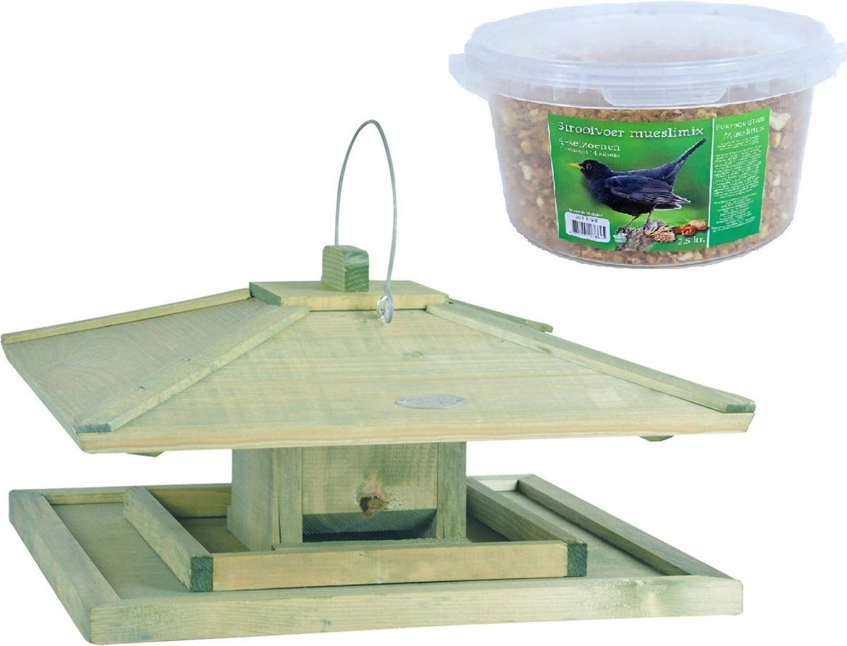 Nichoir japonais/silo à aliments en bois 38 cm avec mélange de muesli 4 saisons pour oiseaux. Cette maison de nourriture pour oiseaux suspendue a un grand bol de nourriture et au milieu se trouve un silo de nourriture pour oiseaux afin que vous n’ayez pas à remplir la nourriture tous les jours. Le nichoir est facile à accrocher à une branche ou à un crochet. La nourriture est très nutritive et contient toutes les protéines et vitamines nécessaires pour toutes sortes d’oiseaux de jardin. Les ingrédients de la nourriture à saupoudrer sont composés de manière à pouvoir être nourris aux oiseaux toute l’année. Dimensions nichoir : environ 38 x 38 x 21 cm. Matériau du nichoir : bois. composé de 1x Nourriture pour oiseaux Food scatter food muesli mix 4-saisons 2,5 litres, 1x nichoir japonais/silo d’alimentation en bois 38 cm