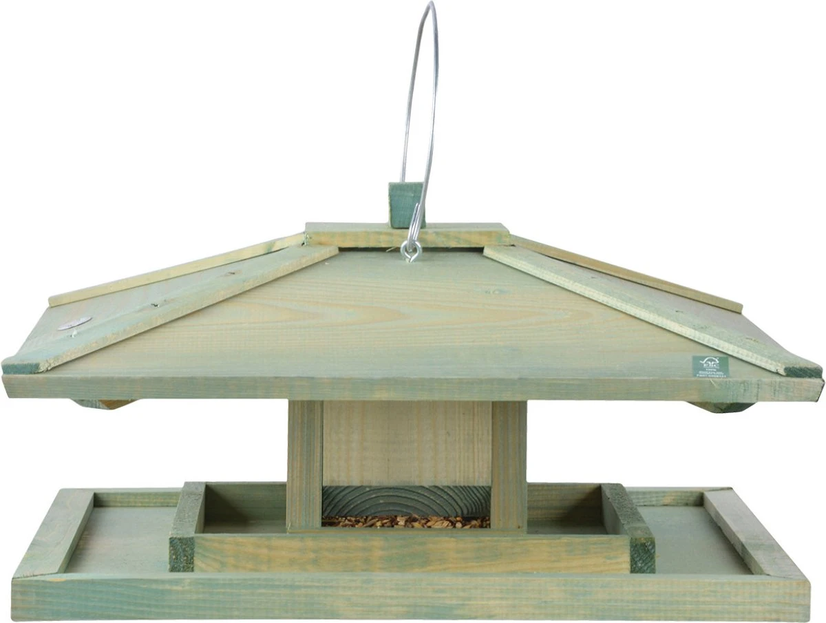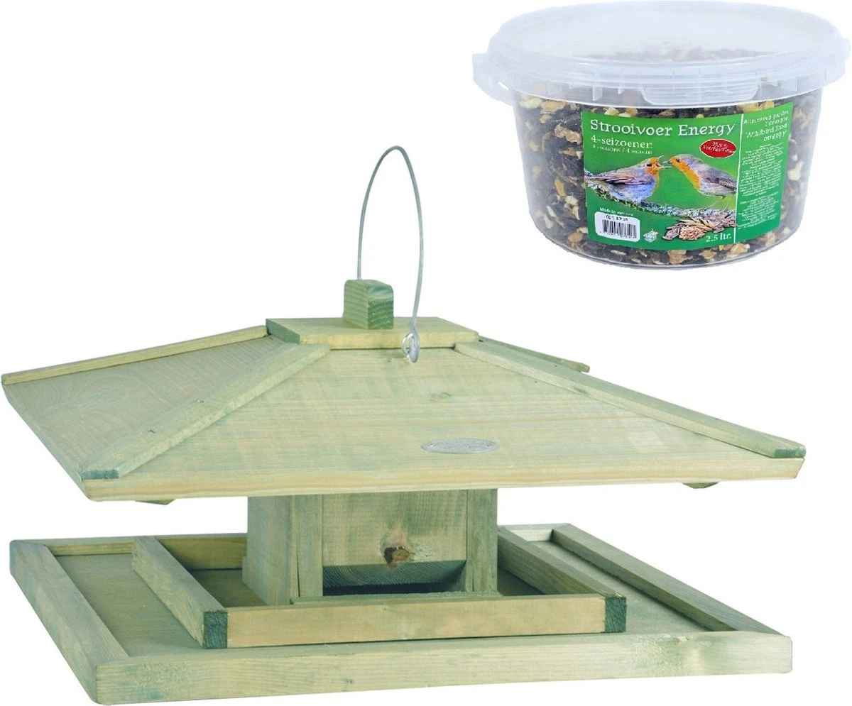 Nichoir japonais/silo à aliments en bois 38 cm comprenant de la nourriture pour oiseaux énergétique 4 saisons. Cette maison de nourriture pour oiseaux suspendue a un grand bol de nourriture et au milieu se trouve un silo de nourriture pour oiseaux afin que vous n’ayez pas à remplir la nourriture tous les jours. Le nichoir est facile à accrocher à une branche ou à un crochet. La nourriture est très nutritive et contient toutes les protéines et vitamines nécessaires pour toutes sortes d’oiseaux de jardin. Les ingrédients de la nourriture à saupoudrer sont composés de manière à pouvoir être nourris aux oiseaux toute l’année. Dimensions nichoir : environ 38 x 38 x 21 cm. Matériau du nichoir : bois. composé de 1x Nourriture pour oiseaux Food scatter food energy seau 4 saisons 2,5 litres, 1x nichoir japonais/silo d’alimentation en bois 38 cm