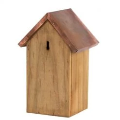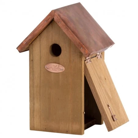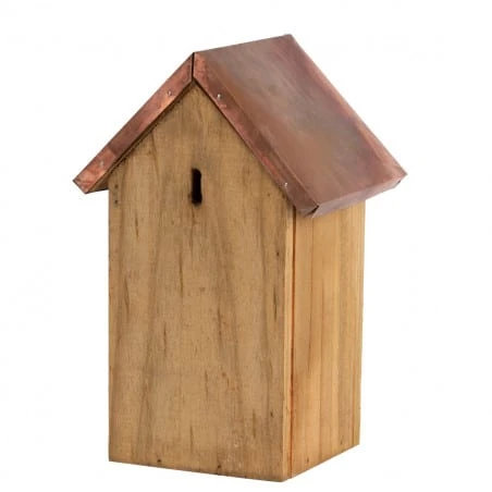 Nichoir en bois et cuivre pour le confort des oiseaux qui apprécieront sans nul doute le design.