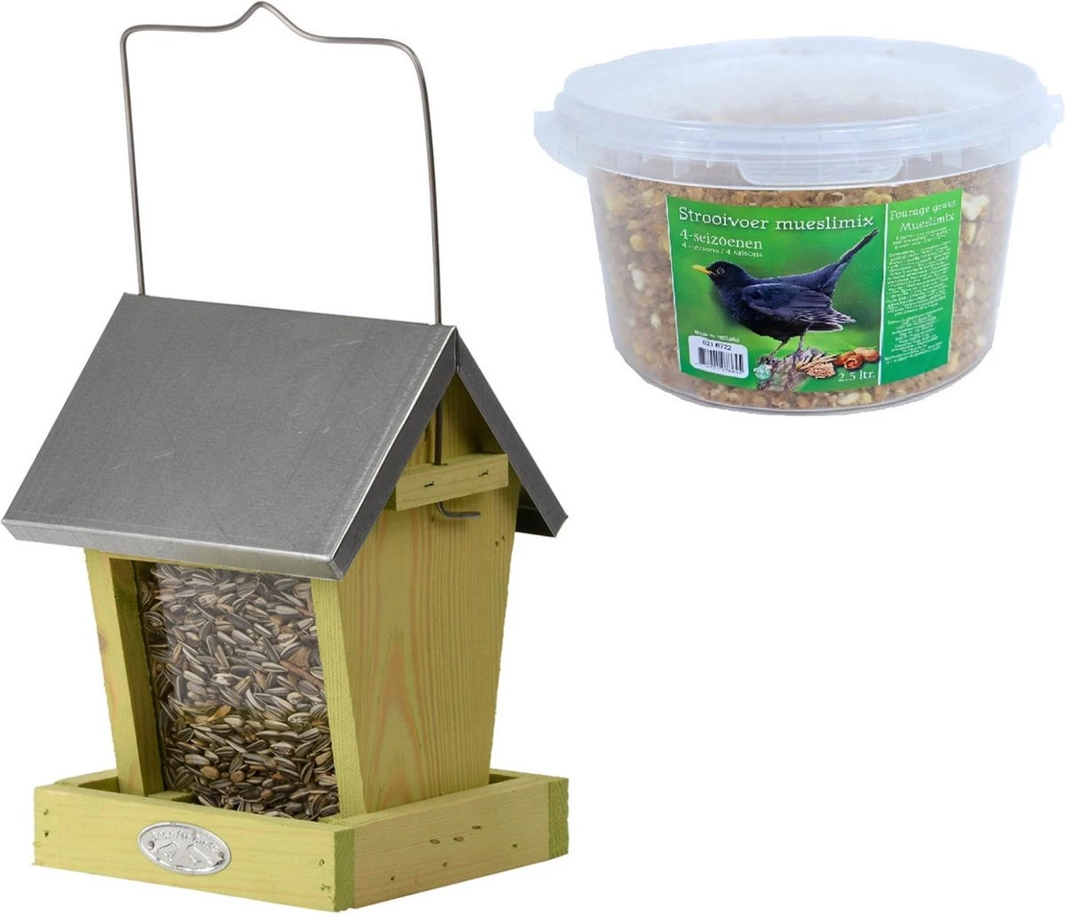 Nichoir/silo d’alimentation avec deux compartiments en bois de 22 cm comprenant de la nourriture pour oiseaux avec un mĂ©lange de muesli 4 saisons. Cette maison de nourriture pour oiseaux suspendue a deux compartiments sĂ©parĂ©s dans lesquels vous pouvez mettre de la nourriture pour oiseaux. Un cĂ´tĂ© est Ă©quipĂ© de plexiglas qui convient pour Ă©taler les aliments, l’autre cĂ´tĂ© est Ă©quipĂ© de gaze qui rend ce cĂ´tĂ© plus adaptĂ©, par exemple, aux noix. La nourriture est très nutritive et contient toutes les protĂ©ines et vitamines nĂ©cessaires pour toutes sortes d’oiseaux de jardin. Les ingrĂ©dients de la nourriture Ă saupoudrer sont composĂ©s de manière Ă pouvoir ĂŞtre nourris aux oiseaux toute l’annĂ©e. Dimensions du nichoir : environ 15 x 16 x 22 cm. MatĂ©riau du nichoir : bois, mĂ©tal, plexiglas, maille. composĂ© de 1x Nourriture pour oiseaux Food scatter food muesli mix 4-saisons 2,5 litres, 1x Birdhouse/feed silo avec deux compartiments en bois 22 cm