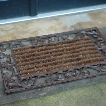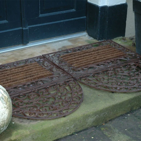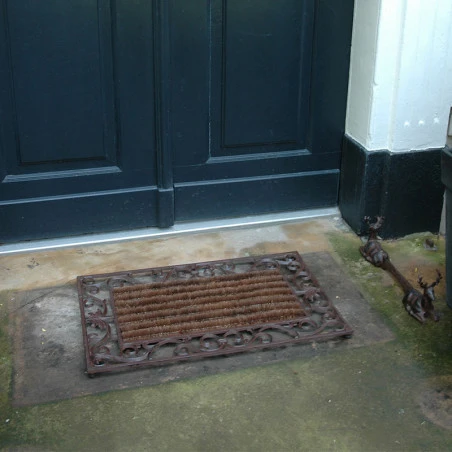 Tapis d’entrĂ©e en fonte aux motifs d’arabesques. La partie centrale de ce paillasson est en coco. Le format original de ce tapis surprendra vos amis dès l’entrĂ©e de votre maison. A la fois utile et objet de dĂ©co, ce tapis d’entrĂ©e apporte une touche rĂ©tro dès votre entrĂ©e.