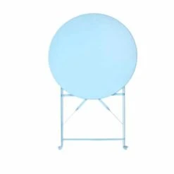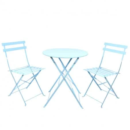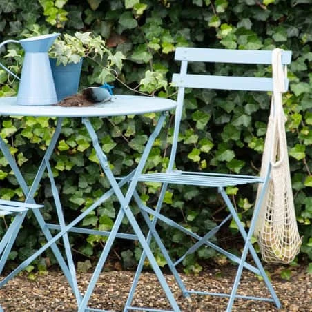 Une touche de couleur dans le jardin avec cette table ronde et ses deux chaises pliantes bleues claires.