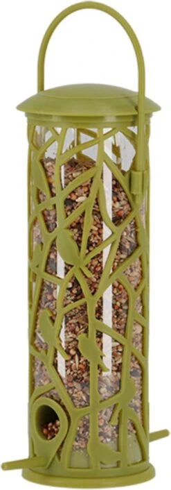 Silo à Vogel avec perchoirs en plastique vert 27 cm. Vous pouvez facilement placer de la nourriture pour oiseaux dans ce silo de nourriture pour oiseaux en faisant glisser le couvercle vers le haut. Le nichoir est facile à accrocher à une branche ou à un crochet. Dimensions : environ 13 x 8 x 27 cm. Matière : plastique.