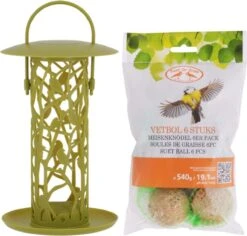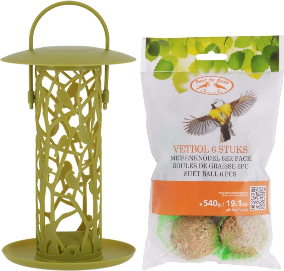Silo à Vogel avec plateau plastique vert 27 cm comprenant 6 boules de graisse. Silo d’alimentation avec plateau où les oiseaux peuvent se reposer paisiblement. Vous pouvez facilement placer 3 boules de graisse dans le silo de nourriture pour oiseaux en faisant glisser le couvercle vers le haut. Le nichoir est facile à accrocher à une branche ou à un crochet. Les boules de graisse sont particulièrement nutritives et fournissent toutes les protéines et vitamines nécessaires à toutes sortes d’oiseaux de jardin. Les ingrédients de ces boules de graisse sont composés de manière à pouvoir être nourris aux oiseaux tout l’hiver et se composent de blé, de farine de maïs, de graines de sorgo, de millet et de suif. Taille du silo d’alimentation : environ 14 x 14 x 27 cm. Matériau du silo d’alimentation : plastique. composé de 1x Boules de graisse pour oiseaux d’hiver 6x pièces, 1x Silo d’alimentation Vogel avec plateau pour boules de graisse en plastique vert 27 cm