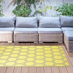 Tapis de jardin nids d’abeilles gris et jaune pour ajouter une touche de dĂ©coration solaire Ă votre jardin. Très lĂ©ger, ce tapis rĂ©versible se dĂ©place facilement selon vos envies ou la mĂ©tĂ©o. Très confortable pour marcher Ă pieds nus, ce tapis nĂ©cessite peu d’entretien.