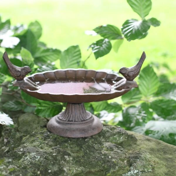 Das Vogelbad hat die Form einer Muschel mit zwei niedlichen Vögeln am Rand.
